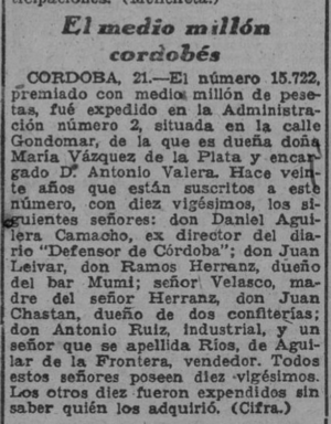 - 21 de diciembre. El sorteo de Lotería de Navidad dejó en Córdoba medio millón de pesetas, correspondiente al nº 15722.