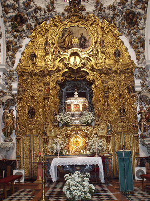 El retablo principal, realizado hacia 1760 por Alonso Gómez de Sandoval, constituye el eje visual de la capilla. Se organiza en torno a un gran arco central que alberga el camarín donde se sitúa la urna con las reliquias.[4]