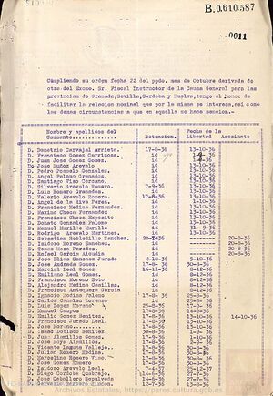 - Cumpliendo su orden fecha 22 de octubre del p.pdo. mes de Octubre derivada de otra del Excmo. Sr. Fiscal Instructor de la Causa General para las provincias de Granada, Sevilla, Córdoba y Huelva, tengo el honor de facilitar la relación nominal que por la misma se interesa, así como las demás circunstancias a que en aquella se hace mención.