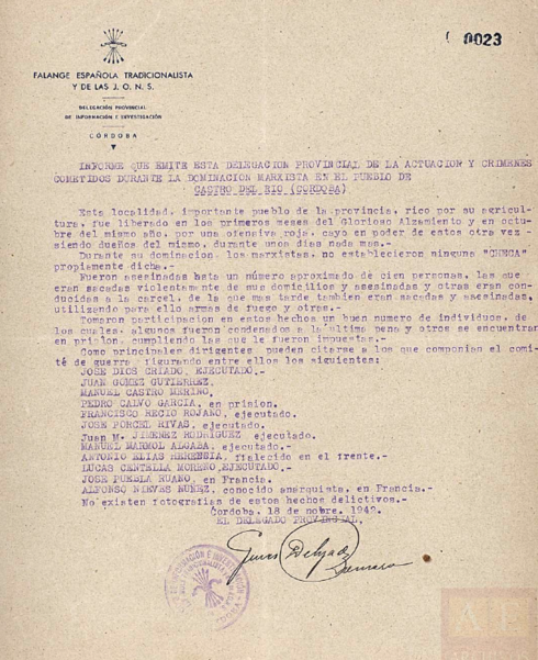 El Informe sobre la actuación y crímenes cometidos durante la dominación marxista en el pueblo de Castro del Río es un documento oficial emitido por la Delegación Provincial de Información e Investigación de FALANGE ESPAÑOLA TRADICIONALISTA Y DE LAS J. O. N. S. de Córdoba. Fechado el 18 de noviembre de 1942, el informe detalla la visión del organismo sobre los sucesos acaecidos en la localidad tras el 18 de julio de 1936.