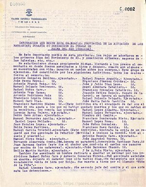 El Informe de la Falange sobre la actuación marxista en Palma del Río es un documento fechado el 18 de diciembre de 1942, emitido por la Delegación Provincial de Información e Investigación de Falange Española Tradicionalista y de las J.O.N.S. de Córdoba.