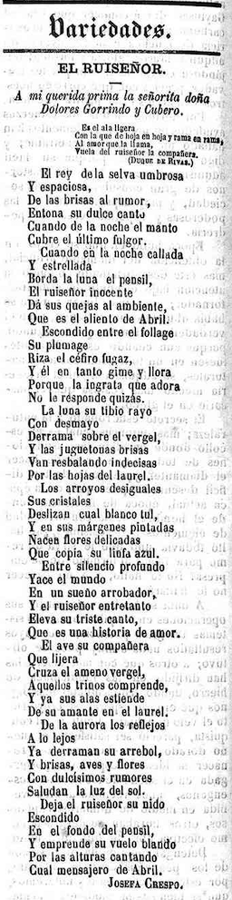 - Una reivindicación velada de la autonomía de la mujer y su derecho a expresarse, perceptible en poemas como Gloria oculta, Yo nací para cantar o A S.M. la Reina D.ª María Cristina de Borbón .