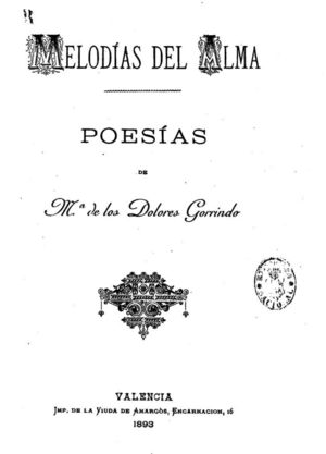 María de los Dolores Gorrindo y Cubero fue una poetisa cordobesa del último tercio del siglo XIX, autora del poemario Melodías del alma (1893). Su obra, marcada por su vocación temprana, la censura familiar y las limitaciones sociales impuestas a las mujeres de su época, la sitúa dentro del grupo de escritoras que, desde la intimidad doméstica, intentaron abrirse paso hacia la esfera pública.