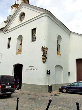 La estatua del Arcángel adosada a una de las esquinas de la Iglesia de Nuestra Señora de la Paz y dispuesta sobre un capitel pertenece a un Triunfo que en junio de 1753 fue levantado en la Plaza de San Basilio, frente a la iglesia del monasterio basiliano de la Paz.