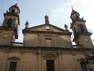 En los vértices del frontón se alzan tres esculturas de los patronos de la ciudad, encargadas el 15 de octubre de 1799 al escultor milanés residente en Córdoba, Jerónimo Butti. Realizadas en "piedra galeña", representan a San Rafael en el centro, flanqueado por San Acisclo a la izquierda y Santa Victoria a la derecha.[12]