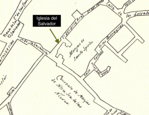 La Iglesia del Salvador formaba parte del extremo nororiental de la Villa, siendo cabecera de la collación que se extendría entre las actuales calles Torres Cabrera y Alfaros. Su ocupación y forma quedaron alteradas desde el siglo XVI por la presencia del cercano convento dominico del Espíritu Santo, cuyas monjas llegaron a anexionarse parte de la iglesia durante un episodio ocurrido probablemente a principios del siglo XVIII[4].