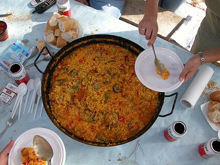 - Estar despreocupado es lo que hace del perolísta un hombre íntegramente libre y humano. Naturalmente, durante el tiempo en que se celebra el «perol», porque antes y después no son las cosas nada fáciles ni agradables. Pero reunidos en un paraje escogido de la campiña o la sierra es otra cosa. Allí se puede gritar a pleno pulmón, aún con mejores alientos y talante que en un estadio. Se recorren llanos -y montes, se moja uno los pies en algún arroyo, si lo hay. Busca ramajos para encender la hoguera, el fuego que servirá para hacer la comida, operación ésta que los perolistas realizan tras unos tragos de vino. El que actúa de cocinero viene a ser el jefe del clan perolístico, quien siempre tiene un lugarteniente con oficio de «pinche». Antes de comer lo que es fundamento del «perol»: cordero asado, pollo con salsa, «paella», se ensaya «la comedia» con unos vasos de vino, rodajas de salchichón o chorizo, aceitunas. Y será cuando el jefe de cocina da unos toques a una sartén con un cazo para que, los perolistas, cuchara en mano, acometan el humeante alimento.
