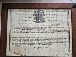 El retablo se encuentra en el mismo espacio que alberga la Bula pontificia emitida en Roma el 19 de mayo de 1837 por Mons. Pablo Marusci, arzobispo de Calcedonia, en virtud de facultades especiales concedidas por el Papa Gregorio XVI, que acredita que el relicario del entorno contiene partículas de los huesos de los Santos Apóstoles Pedro, Pablo, Andrés, Santiago el Mayor, Tomás, Felipe, Bartolomé, Mateo, Simón Tadeo, Matías y Lucas Evangelista, entre otros.