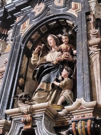 El ático se asienta sobre el entablamento y se decora con un sol de rayos que enmarca la alegoría de la Santísima Trinidad.