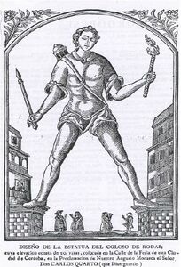 Fué proclamado el rey Don Carlos IV el día díez de septiembre, con las solemnidades acostumbradas y toda clase de festejos públicos, esperando todos continuasen en este reinado las prosperidades del anterior. Uno de los festejos fué la erección de un figurón de veinte varas de alto simulando el coloso de Rodas, en la calle de la Feria, a expensas del gremio de confiteros.[1]