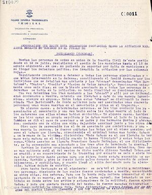 - INFORMACION QUE EMITE ESTA DELEGACION PROVINCIAL SOBRE LA ACTUACION MARXISTA DURANTE SU DOMINIO EN EL PUEBLO DE POZOBLANCO (CORDOBA).