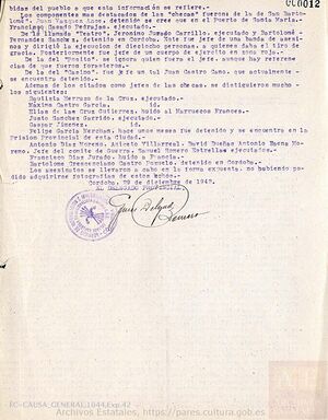 - Otro hecho destacado es el siguiente: se celebró el juicio a veinticuatro personas, dieciocho de las cuales fueron condenadas a muerte, encontrando se entre ellas, dos señoras. Para que la horda roja pudiera presenciar el espectáculo de su muerte, en el patio de la misma cárcel, fue levantado un patíbulo en donde entre los gritos y aclamaciones de la multitud, fueron ejecutadas, y para que quedara recuerdo del hecho, le fueron sacadas fotografías que luego publicó la prensa roja. Estas fotografías fueron hechas por un vecino del pueblo llamado Clemente y que hoy regenta un establecimiento de bebidas del pueblo a que esta información se refiere.-
