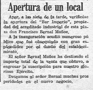 [[Archivo:Inauguración Bar Imperio (1937).png|miniaturadeimagen|Inauguración Bar Imperio (1937)]] | |||