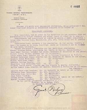 1. Delegación Provincial de Información e Investigación de Falange de Córdoba, Informe sobre Villaralto, Archivos Estatales, 18 de noviembre de 1942, https://pares.cultura.gob.es/ [Consulta: 22 de diciembre de 2025]